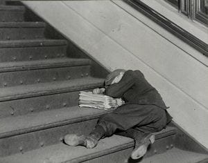 Jersey City, New Jersey, 1912. This is an exhausted newsboy sleeping on his stack of papers mid- day. They worked from before daylight till well after dark.