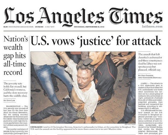 I debated including this next image of a Los Angeles Times edition featuring the image of a dying Ambassador Stevens. I thought it necessary to emphasize the utter lack of concern by Obama and Hillary Clinton for Americans dead, dying or fighting for their lives working for them abroad supposedly under their protection.