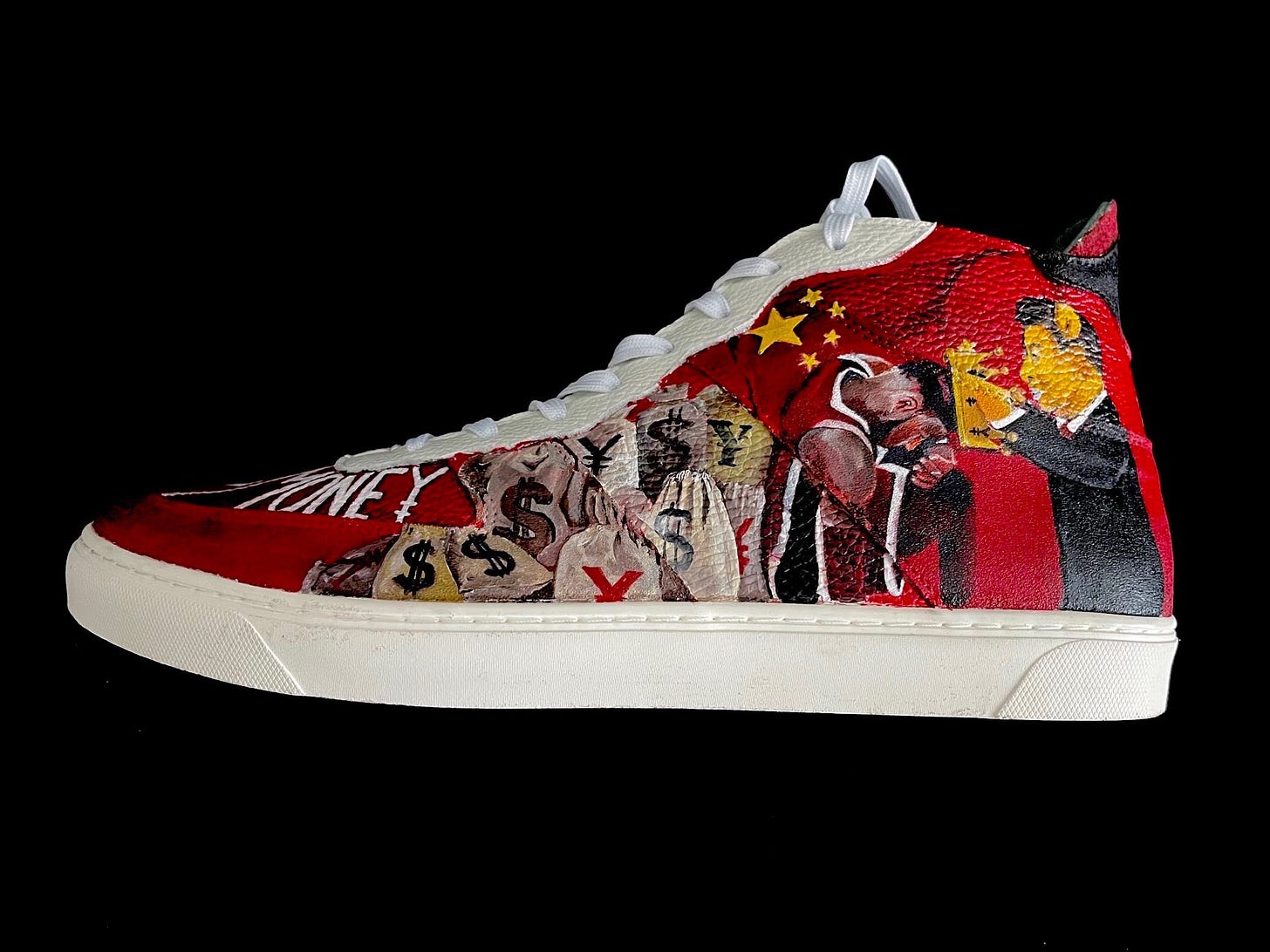 Lebron James gives his two cents on everything under the sun. He and the rest of the NBA are as quiet as a graveyard regarding China and its human rights abuses because China broadcasts NBA games. Two fans were even ejected from a Philidelphia 76ers game for supporting Hong Kong. First their “free Hong Kong” signs were confiscated. They continued to chant “free Hong Kong” and were then ejected! Enes Kanter Freedom chose to resist and speak out fearlessly about Chinese brutality and against LeBron James and the NBA on their silence. He frequently used his shoes to make statements. These are a comment on LeBron James.